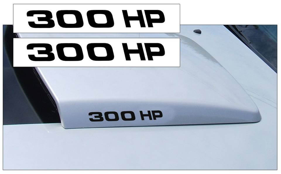 Enhance your 2005-09 Mustang with this refined Hood Scoop Decal Set featuring the distinguished "300 HP" name. This set includes two precisely crafted decals, each measuring 0.9 inches tall by 7 inches long, designed to fit perfectly on both sides of your hood scoop. These subtle yet striking accents add a touch of performance-inspired elegance, highlighting your vehicle’s power and style with understated sophistication. Ideal for Mustang enthusiasts seeking a tasteful upgrade that complements the car’s iconic design.