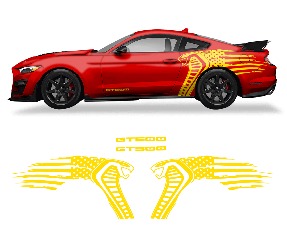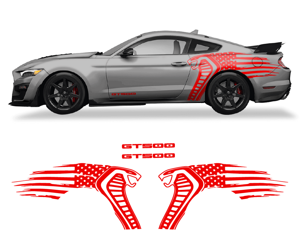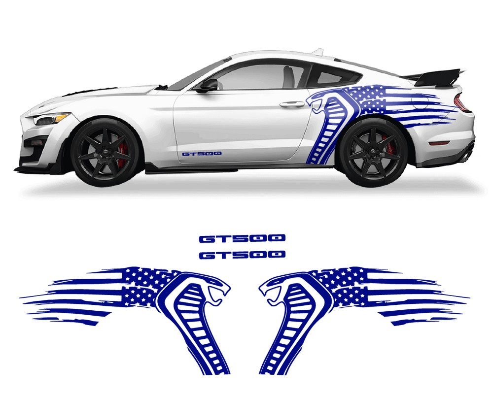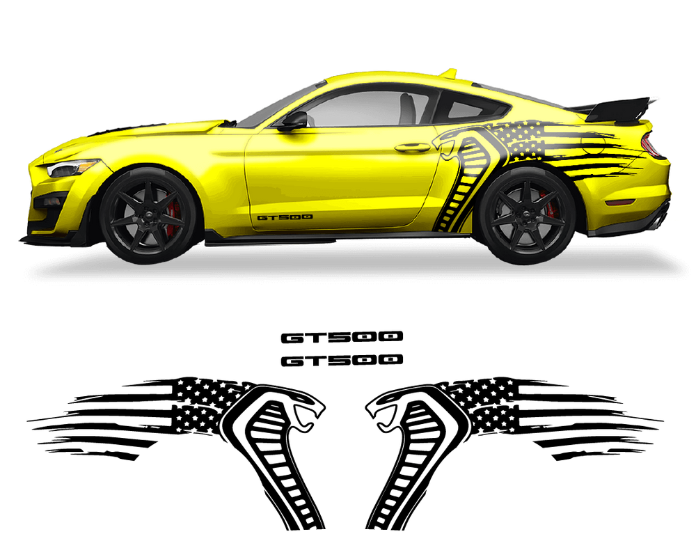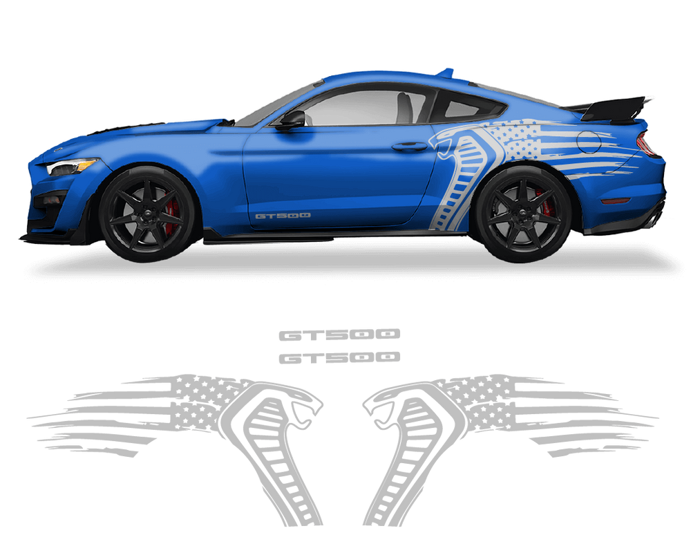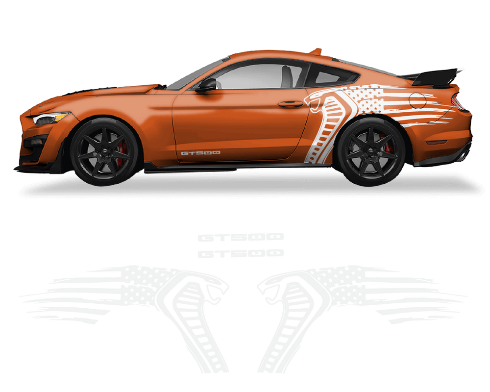 The Ford Mustang Cobra USA Flag GT500 Graphics Set features two meticulously crafted stickers, each equipped with transfer tape for effortless application. Made from premium vinyl, these graphics promise durability lasting between five to seven years.