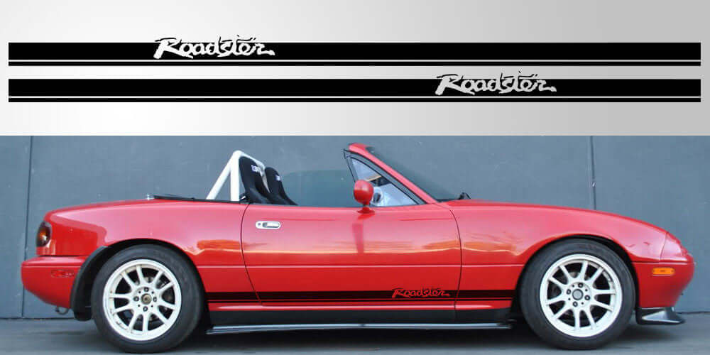 Enhance your Mazda Miata MX-5 with this sophisticated double stripe decal set, designed specifically for NA, NB, and NC models. The 3-inch wide stripe features a refined "Roadster" script cut out, allowing your car’s original color to subtly show through for a sleek, integrated look. Measuring 65 inches in length, this decal adds a distinctive yet elegant touch to your vehicle’s profile. Crafted from premium vinyl, it ensures durability and a smooth finish that resists fading and wear. Elevate your Miata’s style with this tasteful and high-quality decal set that complements its sporty character.