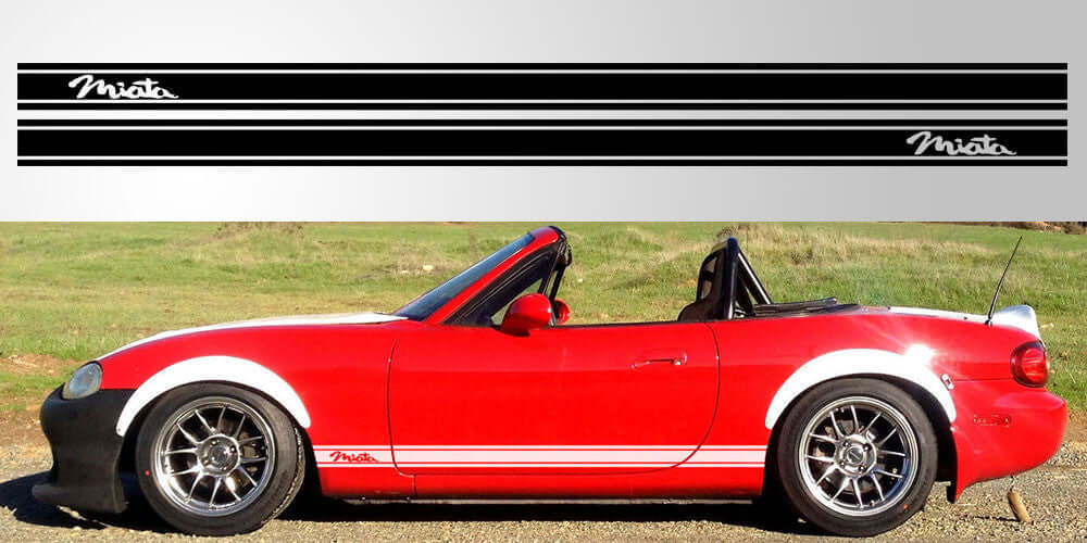Enhance your Mazda Miata MX-5 with this sophisticated Triple Stripe Decal, designed specifically for NA, NB, and NC models. Featuring a sleek 3-inch triple stripe, the decal includes a distinctive "Miata" script cut out to reveal your car’s original color beneath, creating a subtle yet striking contrast. Measuring 65 inches in length and 3 inches in height, it perfectly complements the roadster’s sporty lines. Crafted from premium vinyl, this decal offers durability and a refined finish that resists wear, ensuring your Miata stands out with timeless style and elegance.
