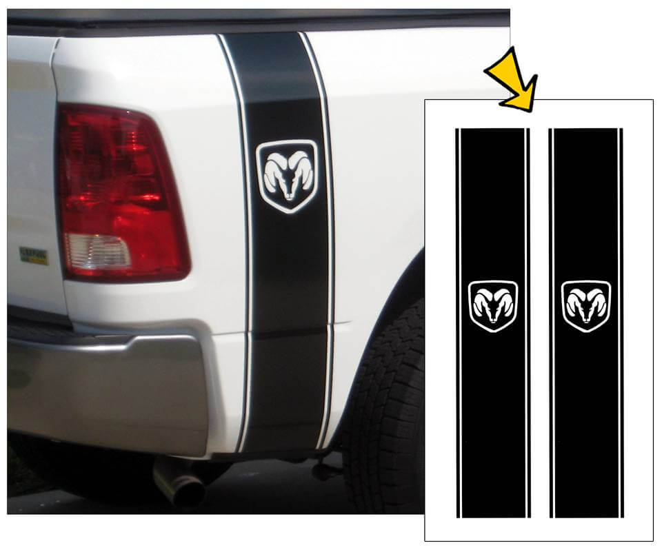 Elevate your Dodge truck’s appearance with this Vertical Bed Stripe Decal Kit featuring the iconic Ram Head logo. Measuring 8.5" wide by 50" tall, this two-piece set includes a bold wide stripe with a precisely cut Ram Head logo and elegant pinstripe borders designed to fit both sides of your vehicle’s bed. Crafted for a seamless, professional look, it enhances your truck’s style while showcasing your pride in the Ram brand. Easy to apply and durable, this decal kit offers a sophisticated upgrade that stands out on the road.