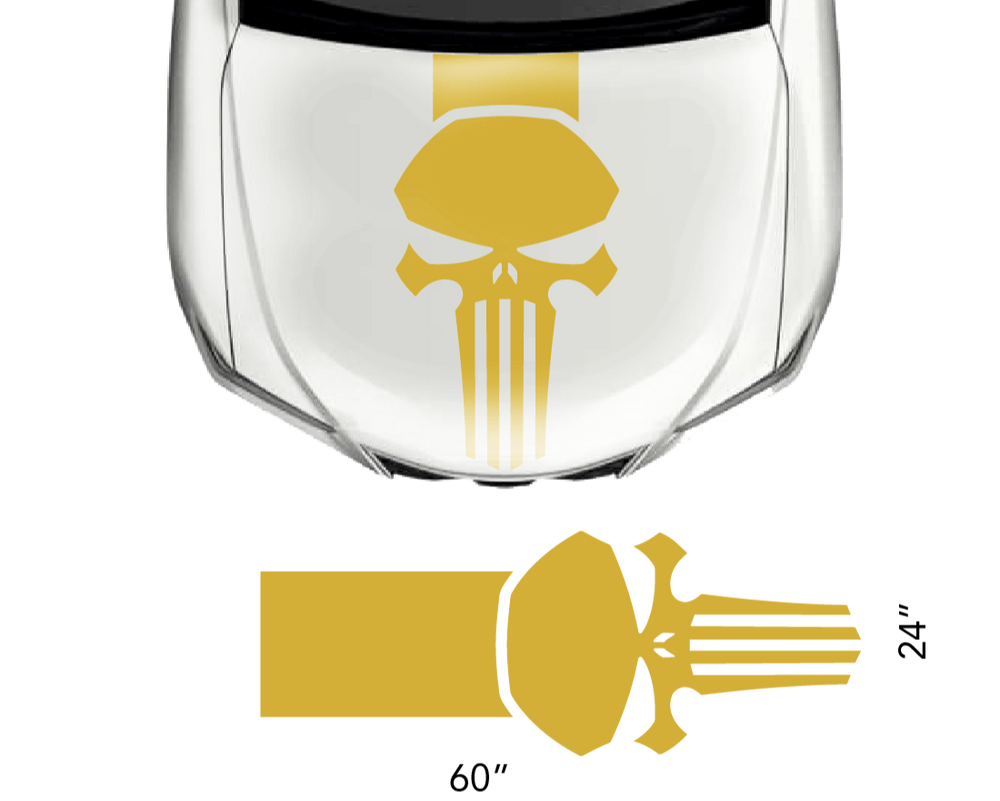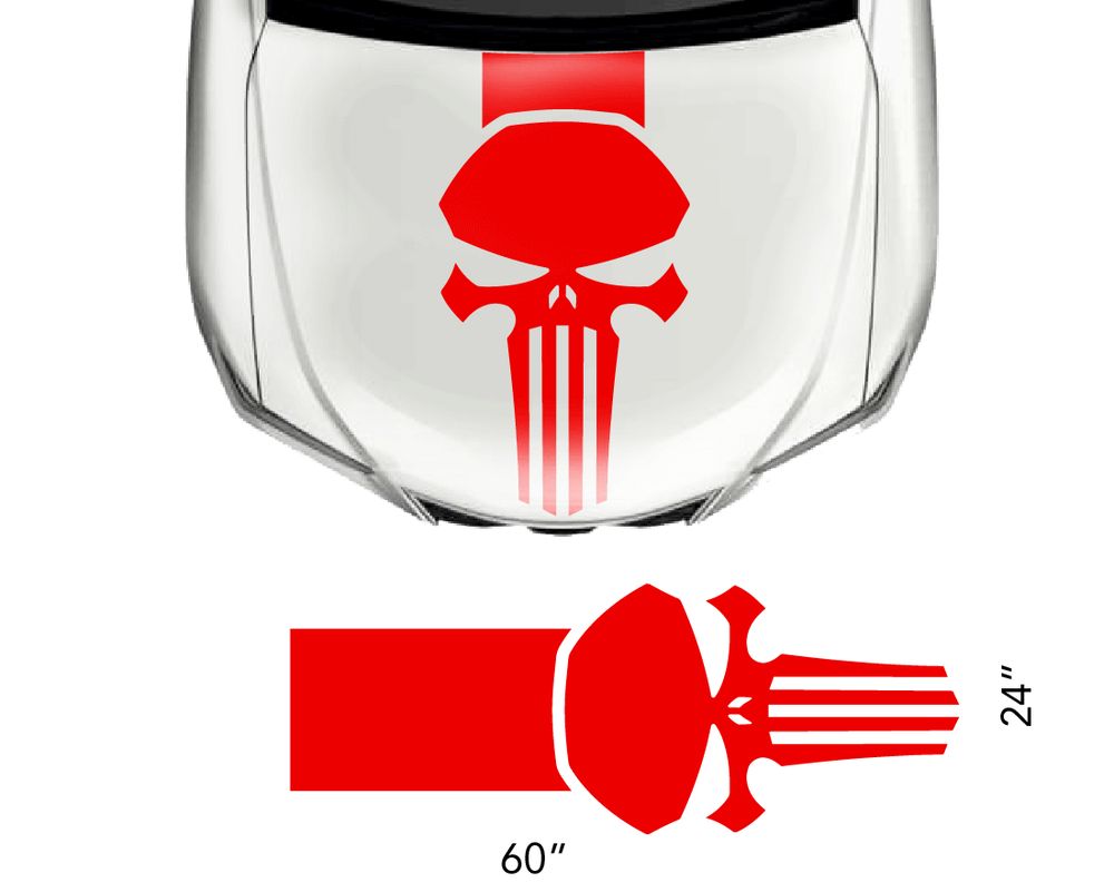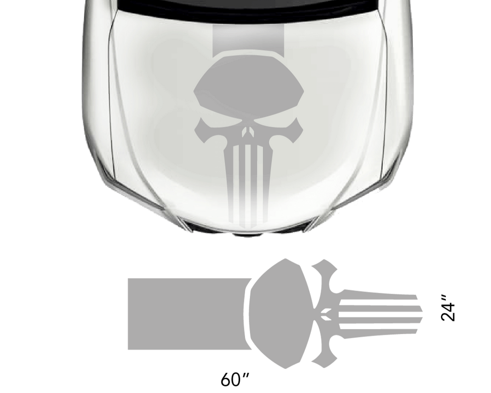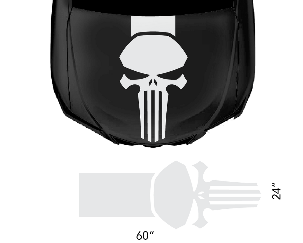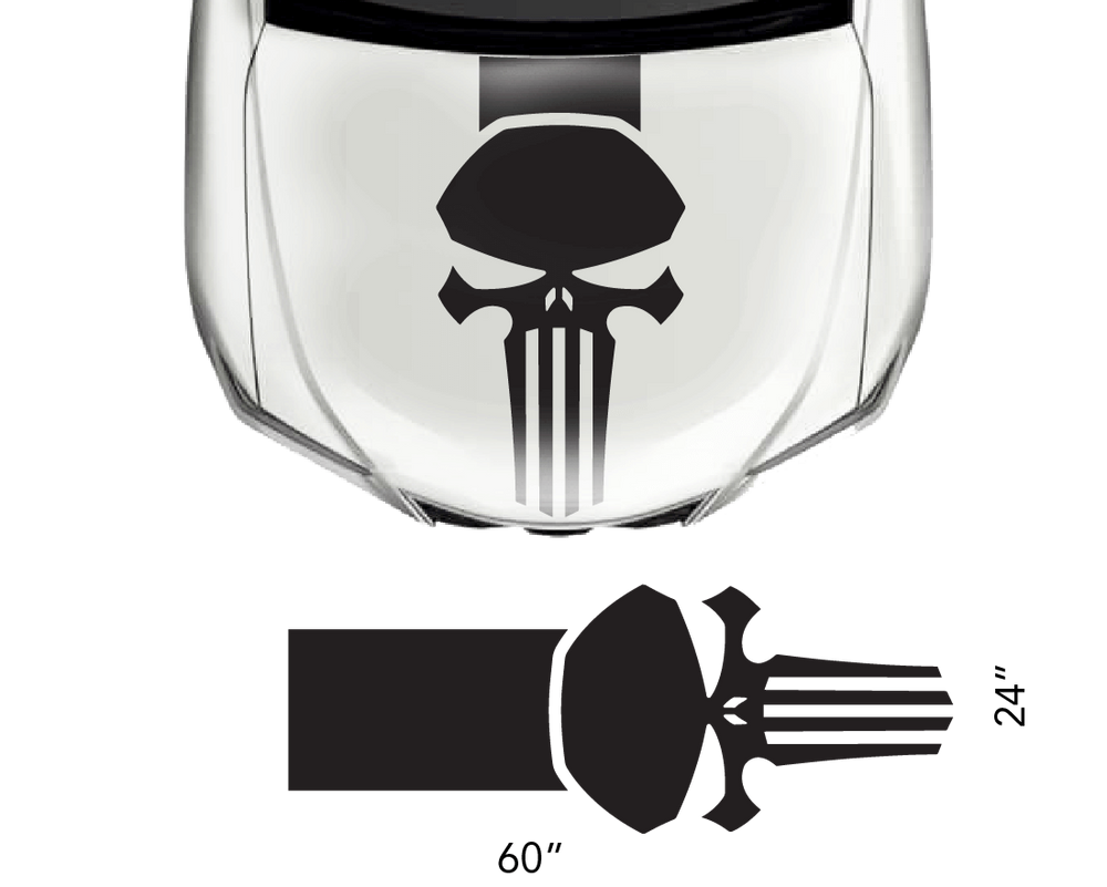 The Universal Hood Punisher Decal Set features a single sticker designed for effortless application using transfer tape. Crafted from premium vinyl, these graphics offer durability lasting between 5 to 7 years.