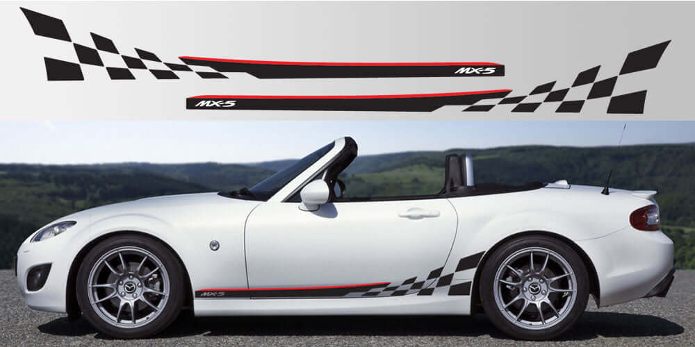 Perfect for your NC Miata MX-5. Designed to replicate the factory decal package for the NC Senshu / Kuro Special Edition Model. When ordering, the first color is the top stripe color and the second color is the lower portion. In the example the top color is red, the bottom color is black.